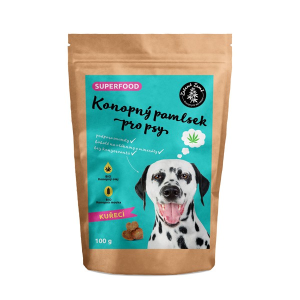 Konopný pamlsek pro psy s kuřecí příchutí. S obsahem konopného oleje a konopné mouky.